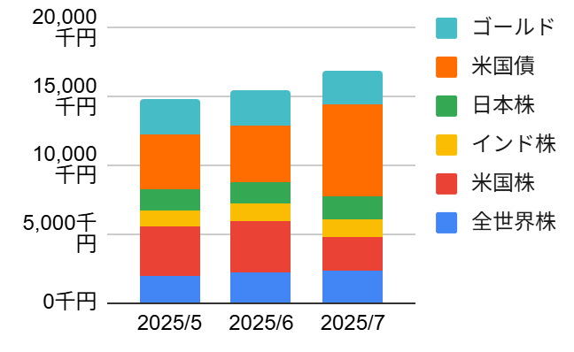 | 全世界株 | 米国株 | インド株 | 日本株 | 米国債 | ゴールド | 合計 | |